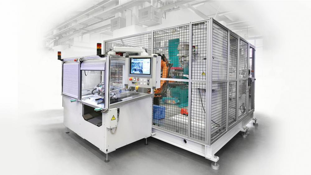 Robot system with automatic riveting machine for the use of self-piercing rivets on shielding parts. With two loading areas that can be loaded in parallel and process monitoring- force-displacement measurement